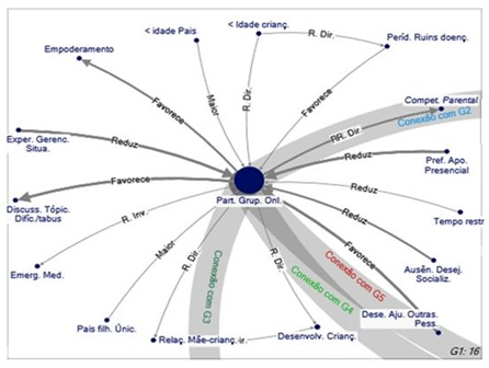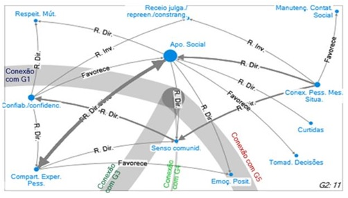 In this "knowledge network", some vertices showed a greater power of centralization, such as "Participation in online groups", "Social support", "Perceived usefulness of the online group", "Anxiety", "Depression" and "Negative feelings" , which are variables that mediate relationships between other variables. Considering the recurrence of findings as above five articles and the degree of centrality, it is possible to synthesize the following integration in the literature: 1) “Participation in online groups” favors “Social support”, “Connection with people in the same situation” and the emergence of the “Sense of community”; 2) the presence of "Social support" has a direct two-way relationship with "Sharing personal experiences", has an inverse relationship with "Negative feelings" and a direct relationship with "Preference for online information" and with "Perceived usefulness of the online group”; 3) The “Lack of face-to-face support” is one of the factors that favors “Participation in online groups”.