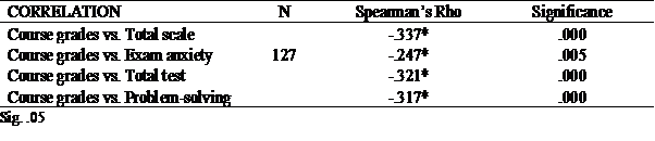 The data of the test correlation between the grades received in the math course and the total test in the Table 7 show a significantly negative correlation of .05 both in the Total test category and in each one of the dimensions studied. This leads to the assumption that as mathematical anxiety increases, academic performance in mathematics decreases