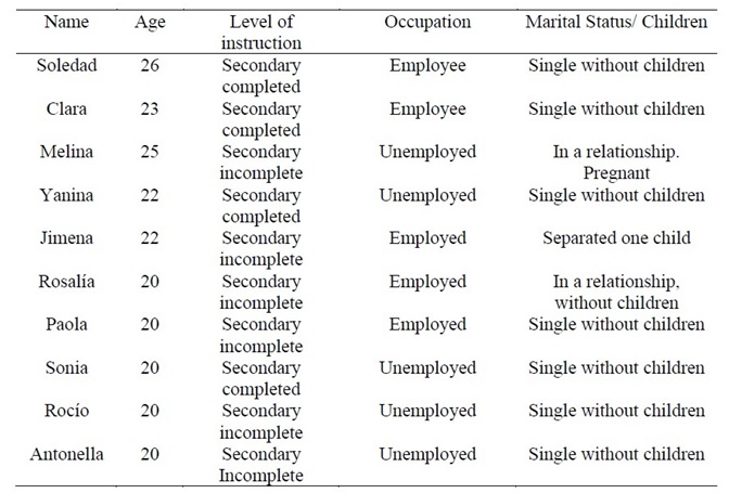 The conformed sample was intentional with cases containing rich information to provide an in depth study (Patton, 1990). The criteria implemented allowed to conform an intensive type sample due to the quality of the information obtained -characterized by the viability and accessibility- as well as being representative of the phenomena under study (being no more than 29 years old, residing in neighborhoods from popular sectors). We have worked with ten women aged between 20 and 26 who were attending both institutions during the period that lasted the collection of data (first semester of 2018). Chart 1 shows information about socio demographic data.