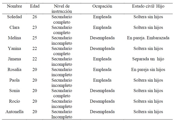 La muestra conformada fue intencional con casos ricos en información para efectuar un estudio en profundidad (Patton, 1990). Los criterios implementados permitieron conformar una muestra de tipo intensiva por la calidad de la información recabada, caracterizada por la viabilidad y accesibilidad, así como ser representativa del fenómeno a estudiar (no tener más de 29 años, residir en barrios de sectores populares).Se trabajó con diez mujeres de entre 20 y 26 años de edad que concurren a ambas instituciones durante el período en que duró la recolección de datos (primer semestre de 2018). En la tabla 1 se presenta información sobre los datos sociodemográficos.