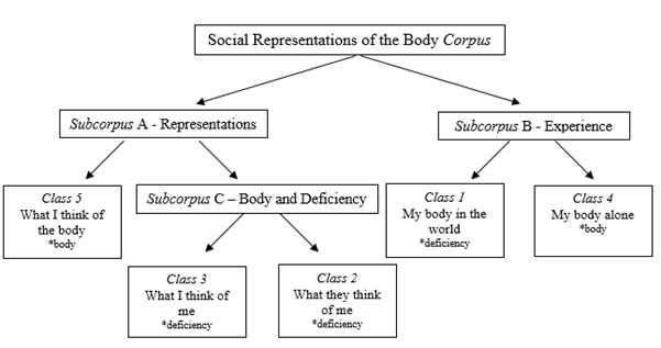The information obtained in the interviews related to the body and physical disability were organized into a single textual corpus and analyzed through Descending Hierarchical Classification (CHD) with the software IRaMuTeq (Interface de R pour les Analyses Multidimensionnelles de Textes et de Questionnariores). The CHD aims to create text segment classes containing similar, but at the same time, different vocabularies from the text segments of other classes (Camargo & Justo, 2013). In the field of social psychology, particularly in social representation studies, the classes generated by the software may indicate social representations or aspects of it, in view of the importance given to linguistic manifestations (Veloz, Nascimento-Schulze & Camargo, 1999).