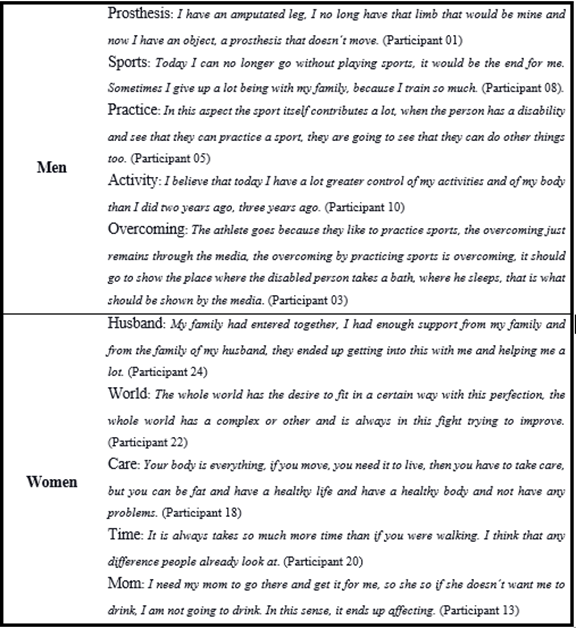 Through the contrast analysis, it was identified that men and women have particularities when relating to the body. The men highlighted content belonging to the practice of sports and the related aspects of overcoming this, physical activities, and the return to routine activities. The reports indicate that physical activities provide greater performance and quality in their daily activities since they strengthen their musculature, in addition to enabling socialization among peers as a crucial factor in informing the (im)possibilities in the face of injury. Still, the word prosthesis was also associated with men, possibly by the interviewees who suffered amputations being male. In this sense, they consider it as a fundamental tool for the quality of life and ease of locomotion.