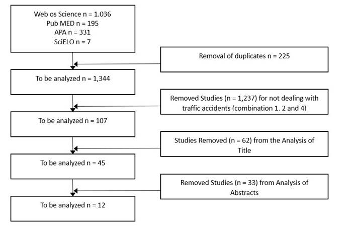 For the selection of the studies, four steps were performed: (i) removal of duplicate material; (ii) exclusion of studies that did not address traffic accidents; (iii) publication title analysis; (iv) abstract analysis.