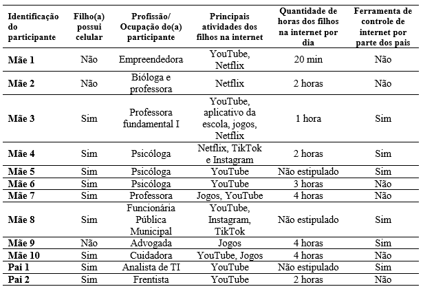 Como podemos notar, a maioria das crianças (n = 9; 75 %) possui seu próprio celular, concentrando suas atividades na utilização das plataformas Youtube e Netflix, além de jogos on-line. Além disso, os pais se dividiram quanto à questão da utilização de instrumentos de monitoramento de conteúdos acessados pelos filhos, sendo que metade dos entrevistados utiliza tal recurso.