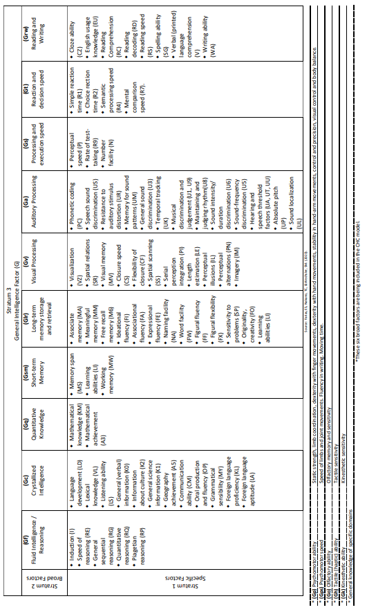 Notes: Fluid intelligence (Gf), Crystallized intelligence (Gc), Quantitative knowledge (Gq), Short-term memory (Gsm), Long-term memory storage and retrieval (Glr), Visual processing (Gv), Auditory processing (Ga), Processing and execution speed (Gs), Reaction and decision speed (Gt), Reading and writing (Grw).