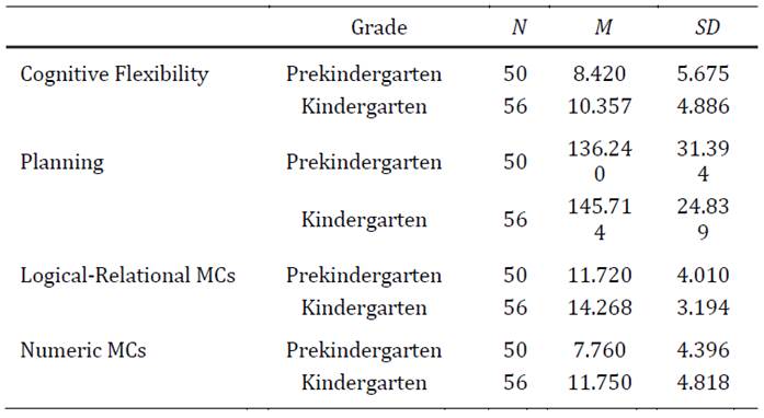 The main objective of this study was to determine the predictive capability of CF and Planning in early mathematical competencies of logical-relational (Logical-Relational MC) type (comparison, classification, correspondence, seriation) and numeric (Numeric MC) type (verbal counting, structured counting, resultant counting, and general knowledge of numbers) in early childhood education children.