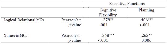 Firstly, to assess the predictive capability of CF and Planning over Logical-Relational MCs and Numeric MCs of the sample’s children, the univariate assumption of normality was analyzed for the Pearson correlation coefficient, which was fulfilled. Subsequently, correlation matrix was generated between the children 's Logical-Relational MCs, Numeric MCs, CF, and Planning.