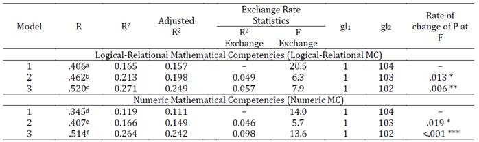 In order to know which EF (i.e., CF and Planning) predicts EMCs (i.e., Logical-Relational MC and Numeric MC) of the participants, a multiple hierarchical linear regression analysis was applied, where the explanatory variables were introduced as predictors according to the degree of correlation with the dependent variables of Logical-Relational MCs and Numeric MCs. Given this, the executive domains that showed higher correlation with the EMCs were added in each regression model.