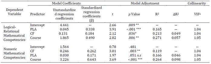Multiple linear regression models: CF and Planning as predictors of children's mathematical competencies