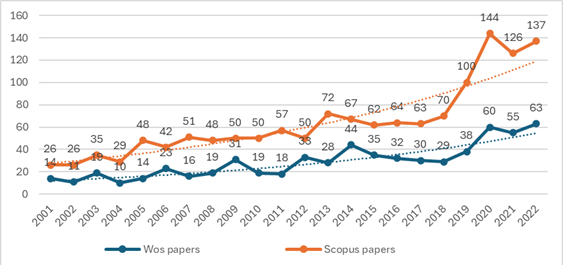 Figure 1 shows the annual scientific production published in the Scopus and WoS databases related to suicide and suicidal risk in childhood and adolescence between 2001 and 2022. An annual increase was observed in the number of scientific publications between 2001 and 2021: 7.42 % in WoS; and 8.24 % in Scopus. It is highlighted that the production rate per year is exponential and constant in both databases, evidencing an area of consolidated research and continuous scientific production.