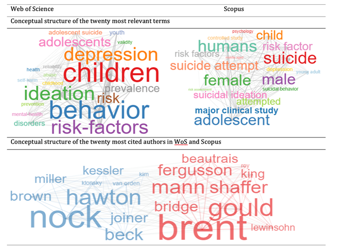 Recent bibliometric studies have explored the progress of research about the phenomenon of suicide (Astraud et al., 2021; Gómez, 2022; Grover et al., 2021) with a special interest in analyzing the number of publications, citations of the most influential authors, journals, organizations, countries, and research areas. These studies are useful for mapping trends in the advancement of scientific publications, also, it is important to permanently analyze the production of knowledge about suicidal behavior in children and adolescents. However, there are few bibliometric studies implemented graphic algorithms based on graph theory to identify research trends. As graphic algorithms allow the interpretation of the variables based on a mixed correlational quantitative analysis with graph metrics and a qualitative analysis through associations between the nodes or concepts (Blanco Correa et al., 2020), this technique can enrich knowledge around the research of suicide, and its risk factors in different populations of boys, girls, and adolescents.