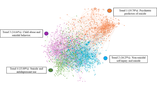 Figure 3 shows the dominant clusters of the final network. Four main clusters were identified as the representing research trends. These clusters show the behavior of knowledge production in each of the perspectives found. Cluster 1 represents 19.78 % of the network and is aimed at studies on clinical predictors of suicidal behavior, including suicide ideation and attempts in childhood and adolescence, as well as psychiatric problems (depression and anxiety). Cluster 2 represents 16.25 % and groups studies on nonsuicidal self-injury and its relationship with suicidal behavior. Nonsuicidal self-injury refers to self-destructive behaviors that involve self-inflicted physical harm, without the intent to cause death (Mars et al., 2019). In contrast, suicidal behavior involves thoughts, fantasies, and desires for death until attempted and completed suicide (Stewart et al., 2017). Cluster 3 represent the 14.64 % of the citations showing the relationship between child abuse and suicidal behavior. Finally, Cluster 4 corresponds to the relationship between suicidal behavior and the use of antidepressants in infants and adolescents, made up by the 13.89 % of the citation network. In the last cluster, a significant relationship was found between the use of selective serotonin reuptake inhibitors (SSRIs) and increased suicidal ideation and risk (Figure 3).