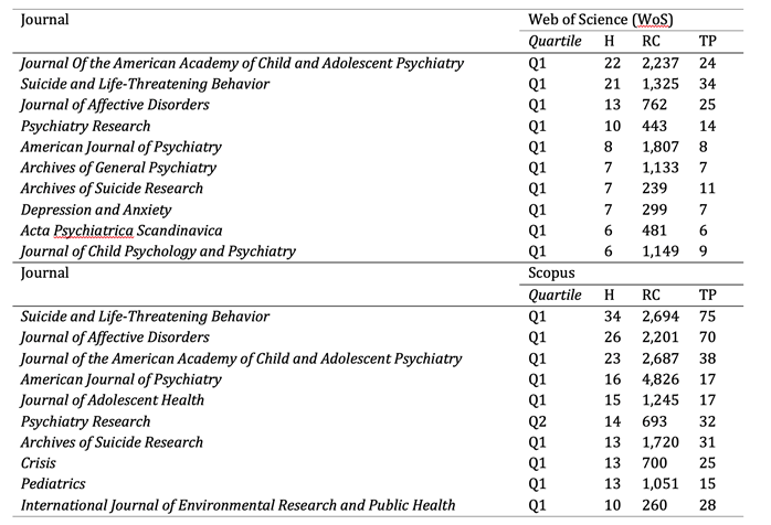 Table 1 presents the ten most recognized indexed scientific journals within the field of study and consulted in the WoS and Scopus databases. It was found that the Suicide and Life-Threatening Behavior Journal has the highest number of publications (WoS = 34, Scopus = 75); the Journal of the American Academy of Child and Adolescent Psychiatry has the highest number of received citations in WoS (n= 2,237); and the American Journal of Psychiatry has the highest number of received citations in Scopus (n= 4,826). From the results it is highlighted the importance of studying suicide in childhood and adolescence as its scientific production is published in high-impact journals (Q1).