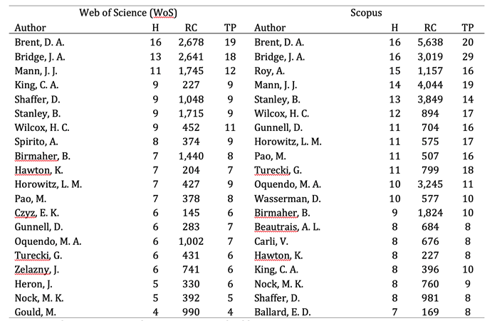 Table 2: Most influential authors in the field of suicide in childhood and adolescence
