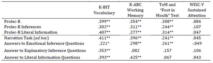 Performance in the K-ABC working memory subtest was significantly associated to the measures: Prolec-R (Rho = .354, p < .01), Prolec-R inferences (Rho = .322, p < .01), Prolec-R literal information (Rho =.277, p < .01), comprehension task (Rho = .397, p < .01), answer to emotional inference questions (Rho = .298, p < .01) and answer to literal information (Rho = .425, p < .01). The ToM measures and next tests showed significant correlations: Prole-R (Rho = .308, p < .01), Prolec-R inferences (Rho = .244, p < .006), comprehension task (Rho = .241, p < .006), answer to emotional inference questions (Rho = .261, p < .003). The sustained attention measure failed to reveal correlations that were significant with the evaluated measures on comprehension.