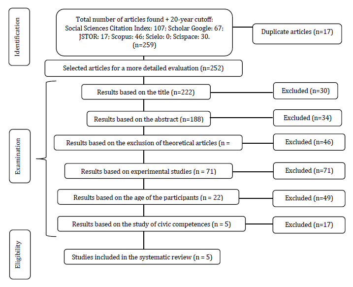 The languages in which the search was conducted were Spanish and English, and the search terms used were as follows: (SPA) deliberación; experimento; adolescentes; competencias cívicas / (ENG) deliberation; experiment; adolescents; civic competences. Likewise, the search engines used were: Social Sciences Citation Index, Google Scholar, JSTOR, Scopus, Scielo, and Scispace. We found that these search engines were the most suitable for exploring the state of scientific production within the field of Political Psychology and related Social Sciences. Figure 1 summarizes the articles found and the selection of these based on the inclusion criteria.
