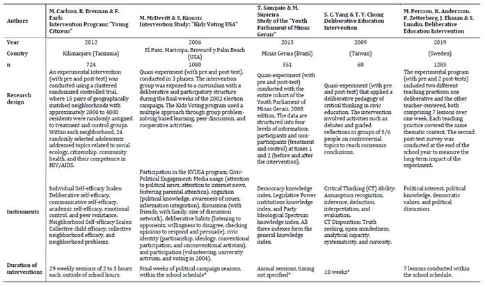 Regarding the operationalization of deliberation, as delineated in Table 1, Carlson et al. (2012) implemented the Young Citizens program. This initiative engaged adolescents in deliberative activities for approximately two hours per week over a span of 29 weeks, focusing on community health topics. These activities were guided by young facilitators from the community. McDevitt and Kiousis (2006) concentrated on students' involvement in the Kids Voting USA program, which was integrated into high schools. This program utilized problem-solving-based group learning, peer discussion, and cooperative activities. Sampaio and Siqueira (2013) explored deliberation within a session of the Youth Parliament of Minas Gerais in 2008. During this session, adolescents deliberated on political issues through debate and voting on various proposals. In Yang and Chung's study (2009), a deliberative curriculum was implemented over a span of 10 weeks in a high school setting. Students were divided into groups of 6/7 to debate opinions for and against political topics. Subsequently, all participants exchanged views for group decision-making and engaged in reflection on the conclusions drawn. Finally, Persson et al. (2019) implemented a deliberative curriculum in high schools, comprising seven Human Rights education lessons guided by their teacher.
