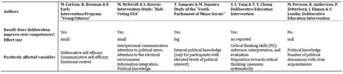 A small number of studies meeting the inclusion criteria were encountered. Most excluded articles were not experimental or quasi-experimental studies and did not involve adolescents as the study population. Overall, the results of the analysis in this review (Table 1 1a 1b) suggest that deliberation has a positive impact on civic competences in adolescents. However, the effect sizes of these interventions tend to be low. In some cases, null effects were found, and in others, while deliberation was shown to improve observed civic competences, effect sizes were not reported. Thus, while deliberation appears to have a positive effect, not every type of intervention yields significant results.