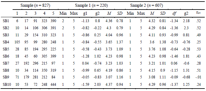 Table 3 shows the descriptive statistics of the SBS for both samples. For sample 1, the average ranges between 3.07 and 4.36 with a variability that fluctuates between 0.78 and 1.37. Regarding sample 2, the mean scores range between 3.081 and 4.316; the skewness coefficients suggest a negative skewness in most of the items; whereas the kurtosis coefficients denote that the largest proportion present a platykurtic distribution, except for items 4, 2, 7, and 9, which presents a leptokurtic distribution. Also, the frequencies of the response alternatives are reported, which is considered a statistic that allows the interpretation of a set of variables of ordinal nature. These values show a more accentuated distribution towards alternatives 4 and 5. The corrected item-test correlations were calculated for the sample of 607 participants, and these show that most of the items are above .20, except for item 9.
