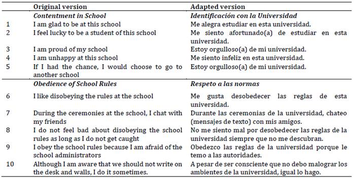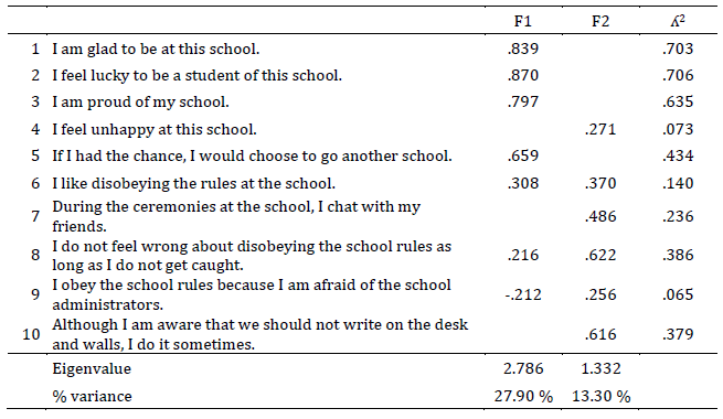 Sense of Belonging Scale (SBS; Akar-Vural et al., 2013). It is a self-reporting instrument with 10 items that measure the sense of belonging to the school in two dimensions: Contentment in School (items 1, 2, 3, 4 and 5), which refers to identification with the school, and Obedience of School Rules (items 6, 7, 8, 8, 9 and 10), which addresses disobedience of the institution’s rules. The SBS items present a Likert-type response scaling of five response options ranging from 1: strongly disagree to 5: strongly agree. The psychometric properties of the measure were analyzed using an EFA with the principal component method and varimax rotation; the assumptions of sample adequacy (KMO = 0.86) and item intercorrelation (χ 2 = 1,526.71; df = 45; p < .001) were verified. The two-factor structure explained 60.72 % of the variance and the factor loadings range from 0.68 to 0.86. Subsequently, through a CFA with the maximum likelihood method, the bifactor structure was corroborated. Factor 1: Contentment in School and Factor 2: Obedience of School Rules, which obtained adequate fit indices (χ 2 = .80.93; p< .001; CFI = .98; NNFI = .97; RMSEA = .059). Validity was also verified about other variables, identifying significant positive correlations with the scores of the Scale of Perceived Social Support and negative and significant correlations with the scores of the UCLA Loneliness Scale; as for reliability, alpha coefficients above .70 were reported, which corresponds to adequate values.