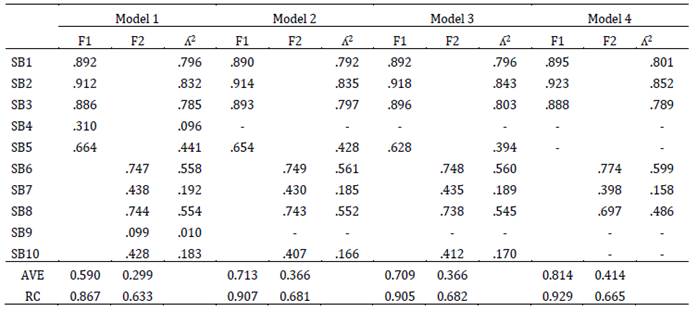The reliability of the SBUS was estimated for Models 1, 2 and, 4. For the first model, factor 1 reaches an omega coefficient equal to .809, while factor 2 reaches a coefficient equal to .576. In the second model, omega coefficients equal to .864 and .593 were reached for factors 1 and 2, respectively. In Model 4, the reliability values were .883 (first factor) and .571 (second factor). As shown, the reliability values of the first factor are adequate in all the models tested; however, the second factor barely reached measures above .50, which suggests that its scores are not consistent.