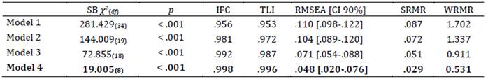 Table 6 shows the fit indexes for the models analyzed. It can be observed that the comparative indexes suggest that Model 4 presents the most parsimonious and coherent structure, in comparison with Model 3, since it suggests the displacement of an item that theoretically was conceived for a different factor.