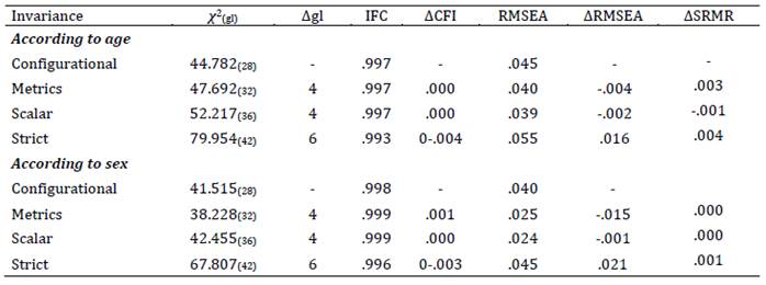 The fit indices reviewed were the chi-square ratio between degrees of freedom (χ 2/df) with expected values below 3, Root Mean Square Error of Approximation (RMSEA) and Standardized Root Mean Square Residual (SRMR) in both cases values below 0.08 suggested by Bentler and Bonnet (1980) were expected. The Comparative Fit Index (CFI) and Tucker-Lewis Index (TLI) were included with acceptable values above 0.95 (Hu & Bentler, 1999). From the factor loadings of both models, the Average Variance Extracted (AVE) was calculated, with satisfactory values of around 0.50; as a result, the evidence of convergent internal validity was verified (Fornell & Larcker, 1981). Additionally, the Composite Reliability (Composite Reliability Coefficient (RC)) was reported, with values above .70 being acceptable. Also, the configurational, metric, strong, and strict invariance was verified for which changes ΔCFI ≤.01, and ΔRMSEA ≤.015 were considered to establish invariance (Byrne, 2008; Putnick & Bornstein, 2016).