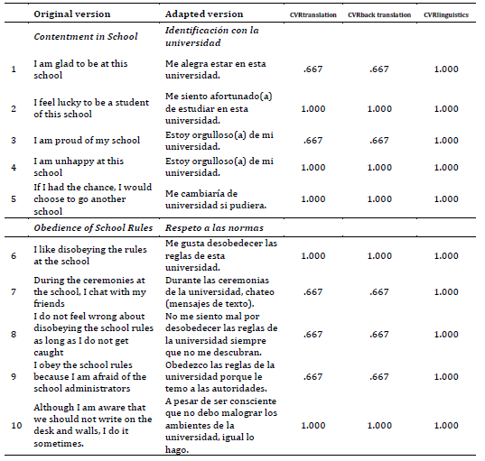 This procedure was replicated to evaluate the translation from Spanish to English (back translation) and the agreement indices showed similar behavior (CVR > 0.66). Additionally, three higher-education and educational psychology experts were asked to observe the adequacy of the language used for each adapted item. Additionally, it was decided to change the word “school” (escuela) to “university” (universidad), and 100 % agreement was reached on all items.