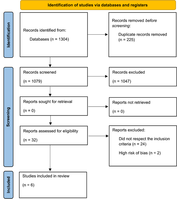 After applying the search strategy to the databases, 1,304 articles were identified, of which 225 duplicates were removed. A total of 1,079 articles were screened by title and abstract, resulting in the exclusion of 1,047 articles. Thirty-two articles were assessed through full-text reading, of which 24 were excluded for not using mindfulness practices based on an established protocol, involving participants older than 60 years, or not being randomized studies. For the risk of bias analysis, 8 articles remained. Among these, 6 studies presented a low risk of bias and were included in the final analysis. Figure 1 presents the PRISMA diagram of the study.