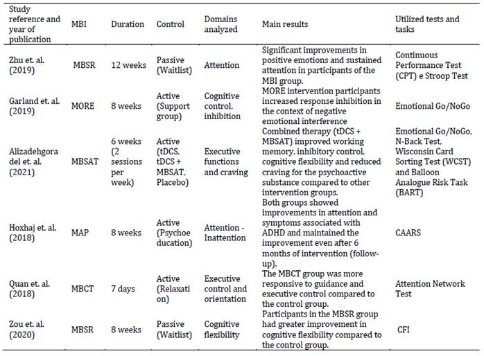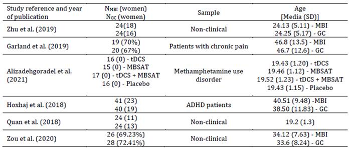 Nota: SD: Standard Deviation; GC: Group Control; MBI: Mindfulness-based Intervention; tDCS: transcranial direct current stimulation; MBSR: Mindfulness-based Stress Reduction; ADHD: Attention Deficit/Hyperactivity Disorder; MORE: Mindfulness-Oriented Recovery Enhancement; MBSAT: Mindfulness-Based Substance Abuse Treatment; MAP: Mindfulness Awareness Practices; MBCT: Mindfulness-Based Cognitive Therapy.