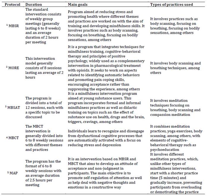 The interventions in all studies were based on well-established protocols with substantial evidence supporting their mental and physical health benefits for clinical and non-clinical populations. Five different protocols were identified: Mindfulness-Based Stress Reduction (MBSR) (Zhu et al., 2019; Zou et al., 2020); Mindfulness-Oriented Recovery Enhancement (MORE) (Garland et al., 2019); Mindfulness-Based Substance Abuse Treatment (MBSAT) (Alizadehgoradel et al., 2021); Mindfulness-Based Cognitive Therapy (MBCT) (Quan et al., 2018); and Mindfulness Awareness Practices (MAP) (Hoxhaj et al., 2018).