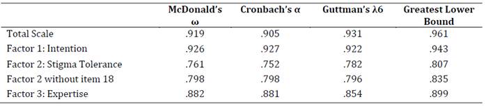 The adaptation in Iceland was carried out by Ægisdóttir and Einarsdóttir (2012), who added six new items and removed two original ones -items 5 and 18- resulting in a total of 22 items while maintaining the three dimensions from the original study in confirmatory factor analyses with high model fit indices. Reliability values showed Cronbach’s alpha scores between .70 and .86. For the Omani population, Alrahji (2021) adapted the instrument with university students, conducting a confirmatory factor analysis that preserved the original structure of the test, retaining all items and obtaining Cronbach’s alpha values above .70, with item-total correlations above .30 in all three dimensions. Regarding the Guatemalan adaptation, after reorganizing item-dimension assignments, the authors achieved adequate fit, with item-subscale correlations ranging from .54 to .83 and Cronbach’s alpha scores of .84 for intention, .74 for stigma tolerance, and .80 for expertise (Figueroa et al., 2020).
