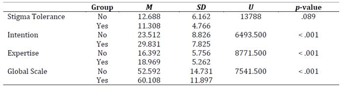 In Table 5, significant differences between the two groups can be observed, both in the intention and expertise dimensions, as well as in the overall score, indicating a statistically higher value for those who are attending therapy.