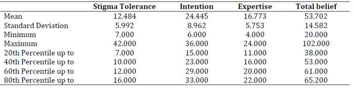 Regarding discriminant validity, the findings indicate higher scores for intention, expertise, and overall belief among individuals attending therapy. This aligns with findings in Oman (Alrahji, 2021), where different scores were reported based on therapy attendance. This suggests that the test can effectively differentiate participants' beliefs based on their history of psychological service use, an interesting finding for future research. For the stigma tolerance dimension, no significant differences were found between groups. This may be explained by findings from Aguirre-Velasco et al. (2020) and the Colombian Ministry of Health and Social Protection (2015), suggesting that high stigma toward psychological services remains consistent across various population groups, regardless of therapy attendance.