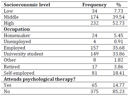 The study included 440 participants, all Colombian, with 321 women (72.95 %) and 118 men (26.82 %). Ages ranged from 18 to 81 years (M = 37.46; SD = 16.99). Data collection was conducted using a snowball sampling method. Table 1 presents information about the participants.