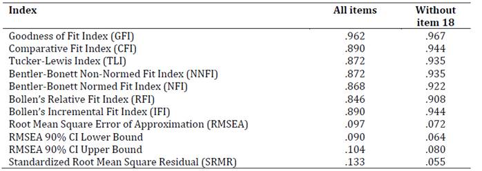 Table 2 presents the confirmatory factor analyses as evidence of validity from the internal structure. Analyses were conducted with all items and then without item 18 (which showed low fit levels, low factor loading, and modification indices indicating that it loaded onto the other two factors).