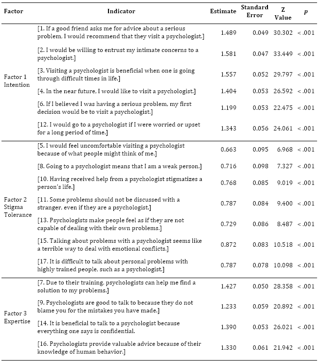 Regarding the number of items, one item was removed, resulting in a total of 17. Item 18 was eliminated, consistent with the study in Iceland, where it also showed low fit indicators and was recommended for removal (Ægisdóttir & Einarsdóttir, 2012). In the Guatemalan adaptation, item 18 was relocated from the stigma tolerance subscale to the Intention subscale to improve its low indicators (Figueroa et al., 2020).