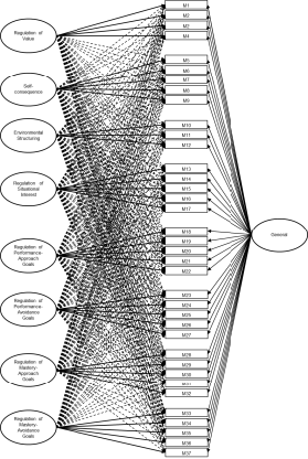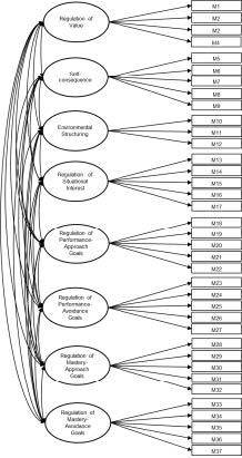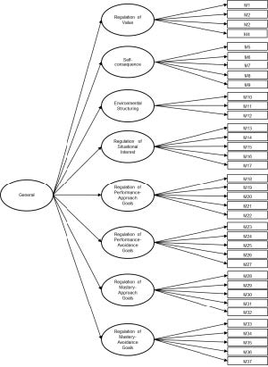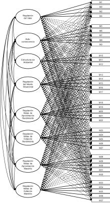 The procedure began with the analysis of the locally adapted MRSQ’s internal structure. Several confirmatory factor analysis (CFA) models were tested-eight first‑order factors (Model 1), eight second‑order factors (Model 2), and a bifactor model (Model 3)-as well as exploratory structural equation models (ESEM): eight factors (Model 4), eight hierarchical factors (Model 5), and a bifactor structure (Model 6). Among these, the first‑order eight‑factor CFA demonstrated the best fit indices. All estimated parameters in this model were statistically significant, and 34 of the 37 items showed optimal factor loadings above .70 (i.e., R² > .50), indicating that each of these items explains more than 50 % of its variance by the associated latent factor (Chicco et al., 2021). The three items falling below the .70 threshold were item 1 (“I imagine situations in which knowing the material or skills would be useful to me”) and item 3 (“I strive to relate what I’m learning to my personal interests”), both within the Value Regulation factor, and item 12 (“I change my environment to make it easier to concentrate on my work”), from the Environmental Structuring dimension. Although these items are somewhat less representative of their respective dimensions, their loadings exceed .40 and are therefore acceptable. Practically, this finding allows users of the instrument to pinpoint the most salient items and, in reporting, highlight students’ strengths and weaknesses based on their responses to these specific items. Overall, these results provide additional empirical support for the proposed model in the Argentinean Cordoban adaptation.