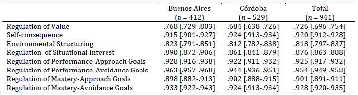Internal consistency for each dimension was then estimated using the omega coefficient for the total sample and for the Buenos Aires and Córdoba subsamples. Values ranged from adequate to optimal. The omega coefficients for each dimension were compared across the three groups-Total, Buenos Aires, and Córdoba-and showed similar internal consistency in all cases except for the dimensions Value Regulation, Situational Interest Regulation, and Performance‑Avoidance Goal Regulation (Table 4).