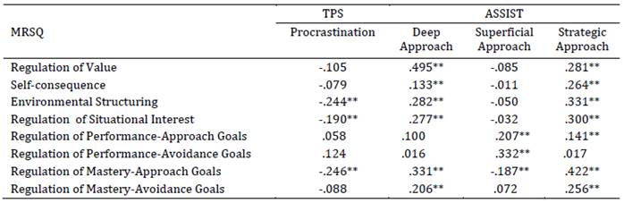 Concurrent validity evidence analysis: A subsample of 249 Buenos Aires students (81.7 % women; age range 18-58, M= 28.14, SD = 8.67, Mdn = 25) completed, in addition to the MRSQ, the Tuckman Procrastination Scale and the Approaches and Study Skills Inventory for Students. These students represented a range of faculties: Psychology (30.2 %), Medicine (13.7 %), Engineering (10.9 %), Economics (10.5 %), Social Sciences (8.5 %), Exact and Natural Sciences (7.3 %), Design and Architecture (5.2 %), Law (5.2 %), Philosophy (4.4 %), and Arts (4.0 %).