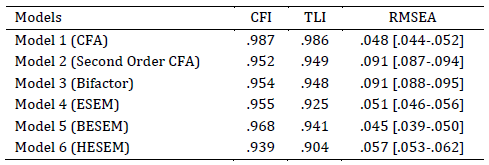 To analyze the instrument’s internal structure, several models were tested to determine which fit the empirical data best. First, using confirmatory factor analysis (CFA), a Model 1 of eight first‑order factors (Figure 1) was evaluated, then a Model 2 of eight second‑order factors (Figure 2), and a Model 3 bifactor model (Figure 3). Next, via exploratory structural equation models, a Model 4 ESEM with eight first‑order factors (Figure 4), followed by a Model 5 BESEM bifactor (Figure 5), and finally a Model 6 HESEM hierarchical model (Figure 6) were tested.