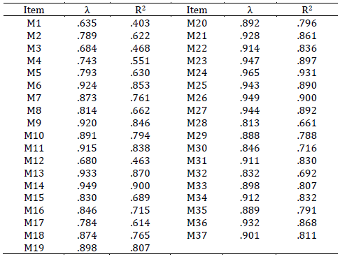 Of all the models tested, the one rendering the best fit was Model 1, corresponding to the first‑order eight‑factor CFA (Table 1). All estimated parameters in the first‑order model were statistically significant. Of the 37 items, 34 obtained optimal regression coefficients, exceeding .70 (Table 2). All standardized residuals were below 1.