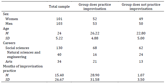 Non-probabilistic convenience sampling was used. The sample consisted of 204 Peruvian young people and adults. The participants were selected according to their belonging to two groups: one group of practitioners of theatre improvisation in the last 6 months (Group does practice improvisation) and another group of non-practitioners (Group does not practice improvisation). Improvisers were recruited through instructors at ten improvisation schools, whereas non‑practitioners were contacted at universities and workplaces. The total sample size provided the minimum statistical power required for path analysis (Kline, 2011). Sociodemographic characteristics of the sample are presented in Table 1.