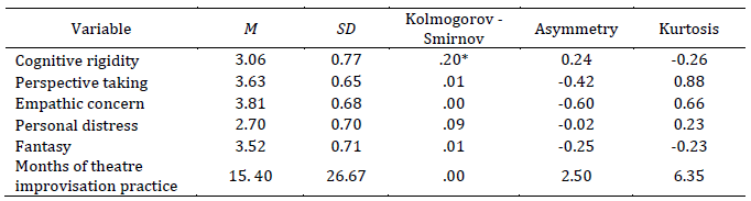 Table 2 shows the mean, standard deviation and normality test statistics for each of the variables studied.