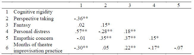 The study concludes that improvisation practice time contributes directly to fantasy variability and indirectly to perspective taking and personal distress, mediated by cognitive rigidity. Furthermore, it is concluded that the affect-to-cognition model of empathy is applicable to the Latin American context and the relationships of affective factors and fantasy may be associated with emotion management. Additionally, it is specified that the practice of theatrical improvisation can be a tool that increases the effectiveness of interventions aimed at increasing empathy, if it is complemented with strategies to manage emotions and uncertainty.