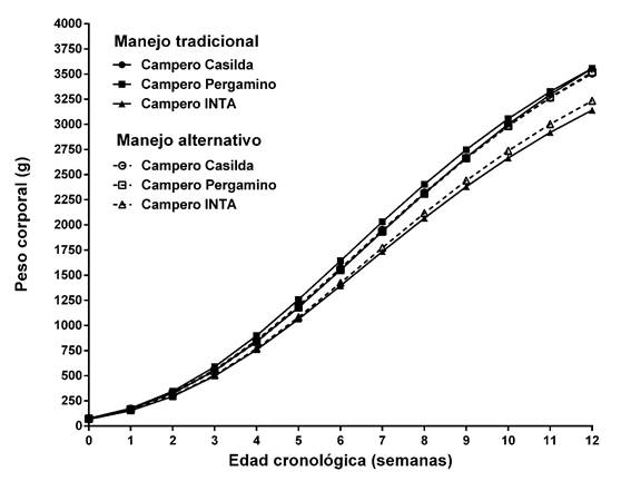 En cada ave alojada a piso, considerada como una unidad experimental, se registró el peso corporal con aproximación al gramo a intervalos semanales entre el nacimiento y la faena. Los datos longitudinales peso corporal-edad cronológica correspondientes a 15 aves de cada subgrupo genotipo x manejo de la alimentación se ajustaron en forma individual con la función sigmoidea de Gompertz (Fitzhugh, 1976): Wt = A exp (- b exp (-kt)), donde: Wt = peso corporal (g) en el tiempo t; A = peso corporal maduro o asintótico (g); b = parámetro de posición, constante de integración sin valor biológico; k = tasa de aproximación al peso corporal asintótico A y t = edad en semanas. El ajuste se llevó a cabo por regresión no lineal utilizando una técnica iterativa (GraphPad Prism versión 2.0) basada en el algoritmo de Marquardt. La bondad del ajuste se evaluó en base a tres criterios: la convergencia de las iteraciones en una solución, del valor del coeficiente de determinación no lineal (R2) ajustado y la aleatoriedad en la distribución de los residuales (test de rachas). A los efectos de los análisis estadísticos los valores de los estimadores de peso corporal asintótico (A) y de tasa de maduración para peso corporal (k) correspondientes a cada ave se consideraron como nuevas variables aleatorias.