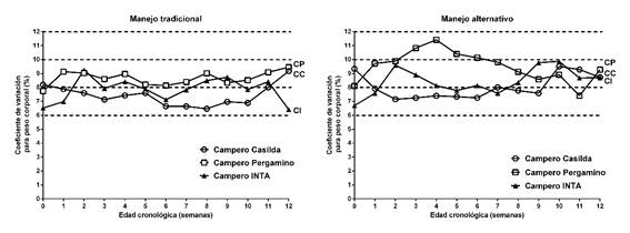 La Figura 2 presenta el comportamiento dinámico del coeficiente de variación como indicador de la uniformidad interna de cada grupo de aves.