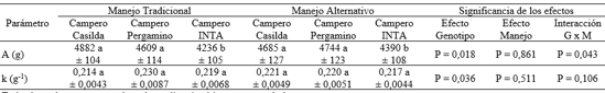 Tabla 2: Estimadores de los parámetros de la función de Gompertz en dos híbridos experimentales de tres vías de pollo campero y en el genotipo de referencia, bajo dos manejos de la alimentación.