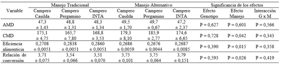 La eficiencia alimenticia y la relación de conversión al igual que los caracteres asociados (AMD y CMD) fueron similares entre genotipos. El manejo de la alimentación no afectó el AMD, pero el cambio del manejo tradicional a alternativo aumentó el CMD (P= 0,041) con disminución de la eficiencia alimenticia (P= 0,014) y, por ende, aumento de la relación de conversión (P= 0,030).