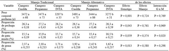 La Tabla 4 resume los valores correspondientes a los caracteres productivos evaluados a la faena.